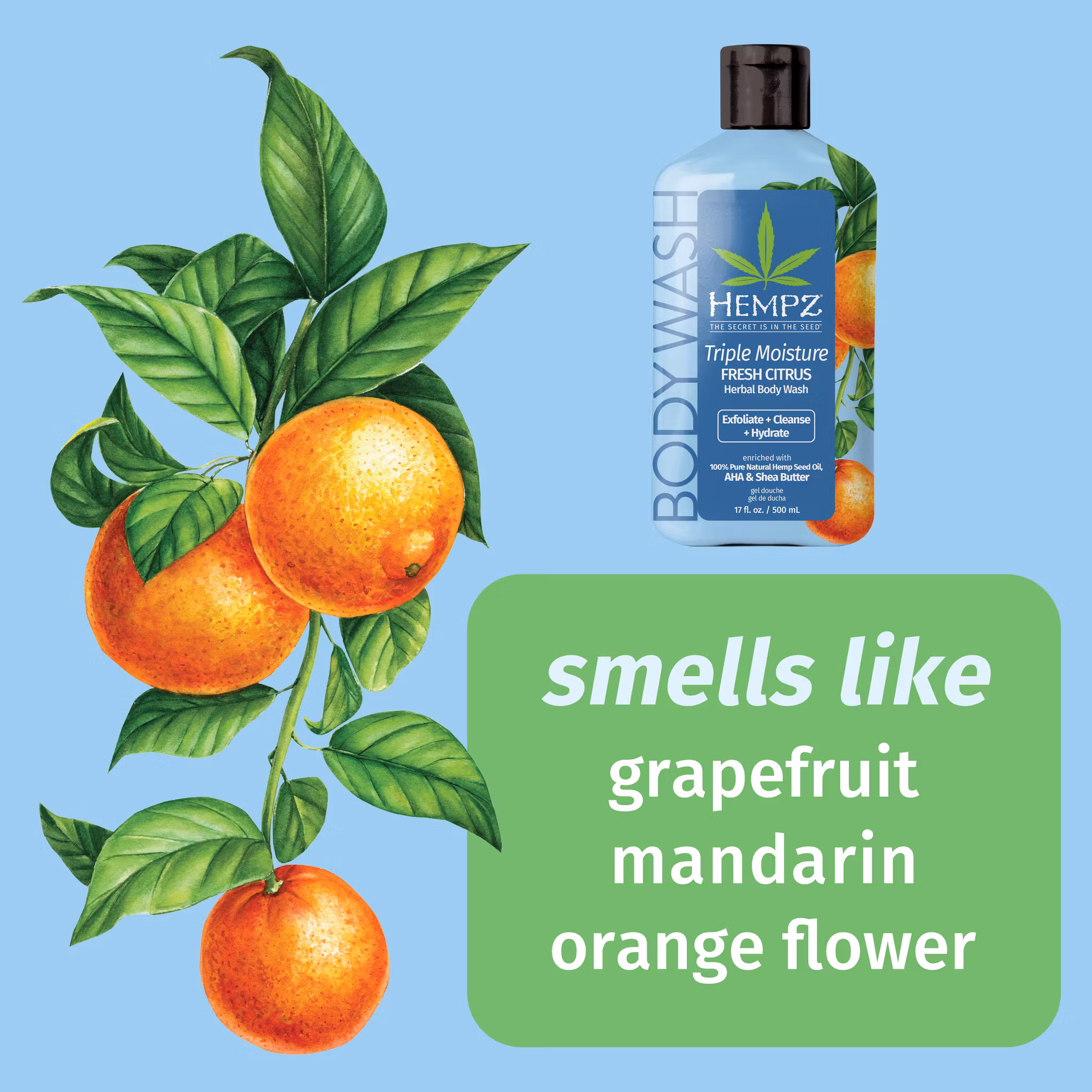 Ren och mjuk hud som strålar -Triple Moisture Herbal Body Wash berikad med naturlig hampafröolja.